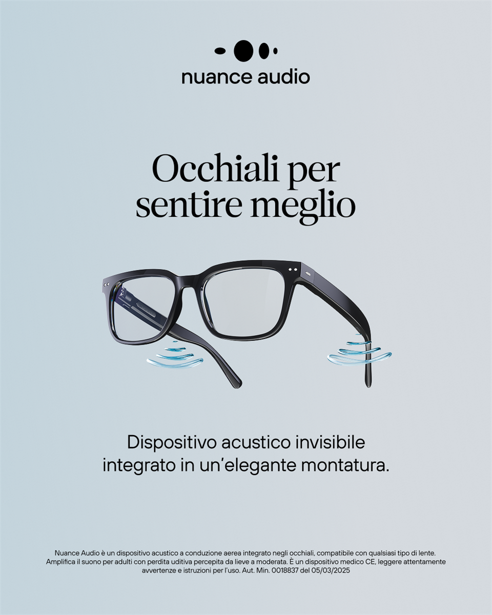 Nuance è un dispositivo medico innovativo (con iva agevolata al 4%) che integra una soluzione acustica invisibile all'interno di una montatura dal design tradizionale/classica.